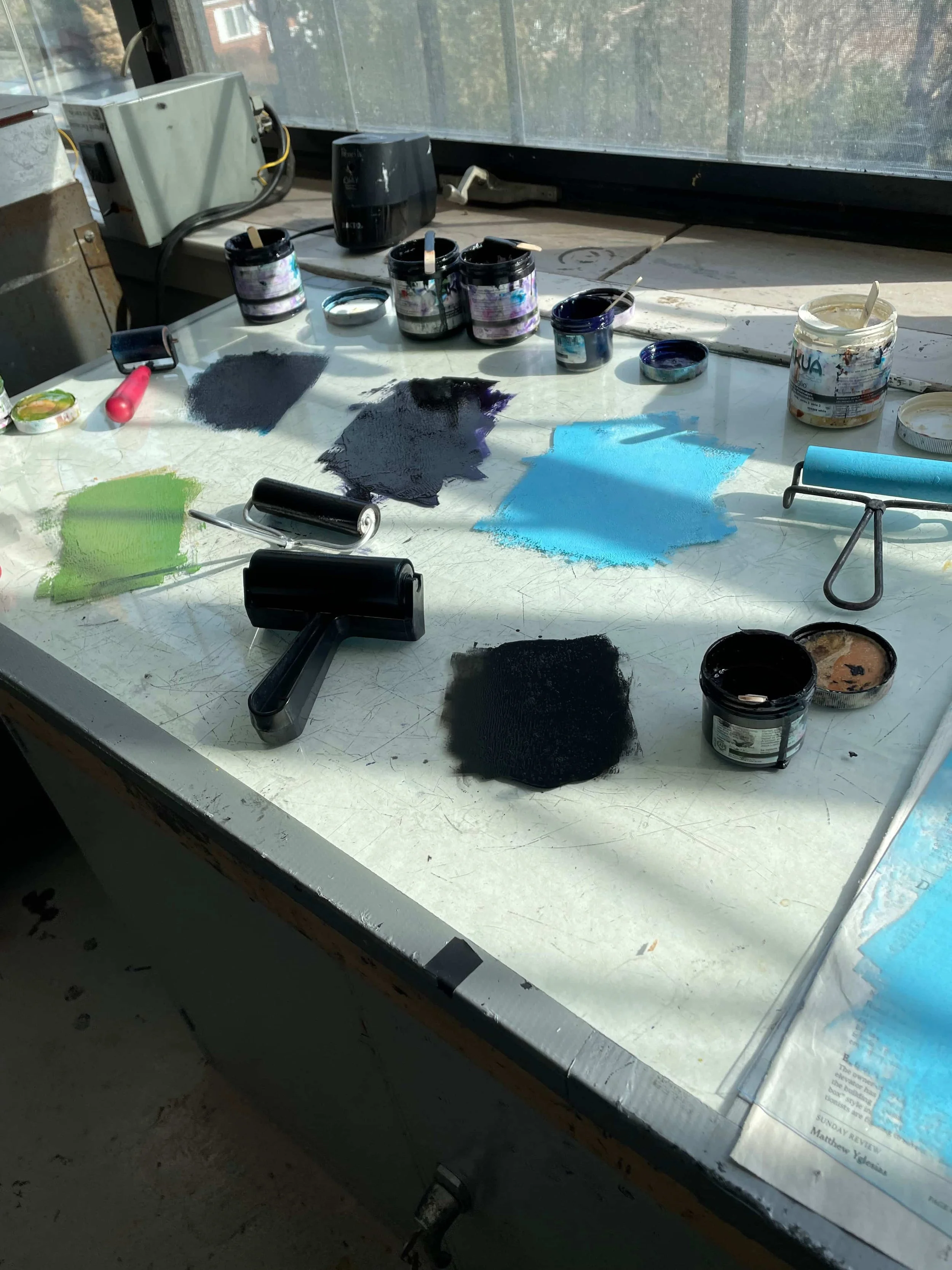 Not many things make me happier than to walk into the light filled printmaking studio on Langston Boulevard in Arlington, VA. The sun gleams off the glass counter tops, the metal presses sparkle and the vast horizontal surfaces wait to be covered in paper and ink. There are so many possibilities as I set out to create art in that space.